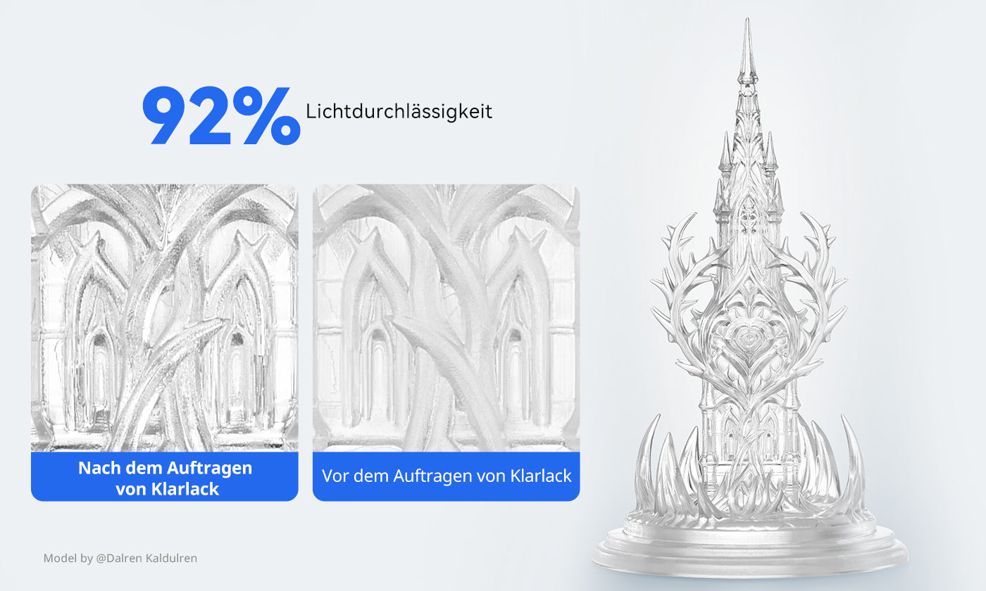 Nach einer Klarlack-Beschichtung bleibt die Transparenz dauerhaft stabil – ideal für Anwendungen mit hohen optischen Anforderungen wie Kunstobjekte, Architekturmodelle oder Display-Elemente.