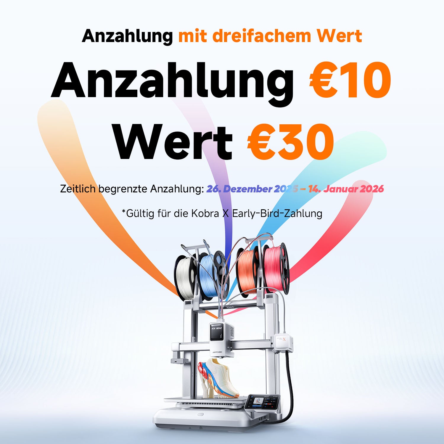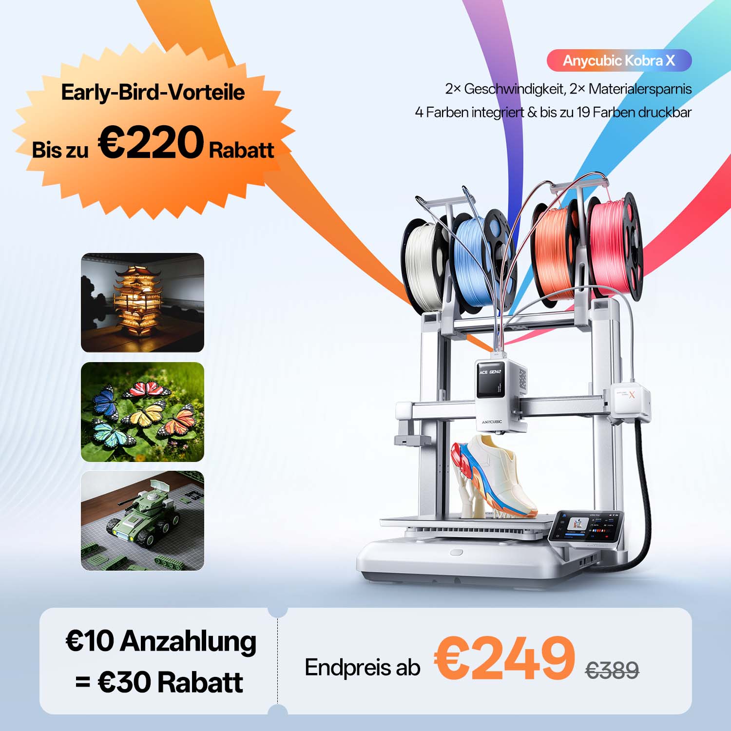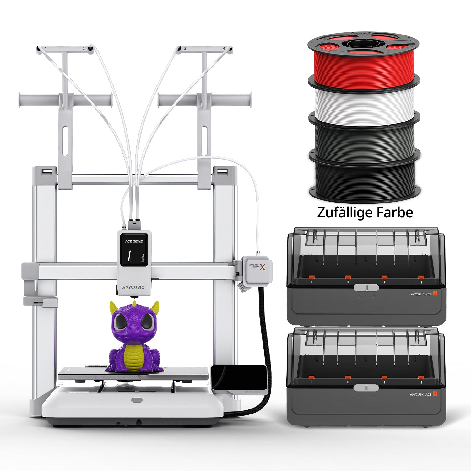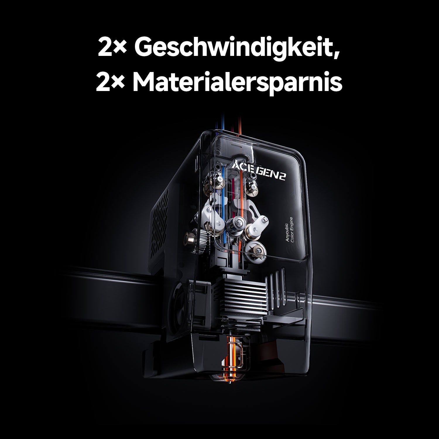 Die ACE GEN 2 Technologie im Kern des Kobra X reduziert die Spüllänge bei Mehrfarben Filamenten um beeindruckende 81,25 %. Das verkürzt nicht nur die Druckzeit erheblich, sondern reduziert auch den Filamentabfall beim Spülen deutlich und macht jede Spule kosteneffizienter.